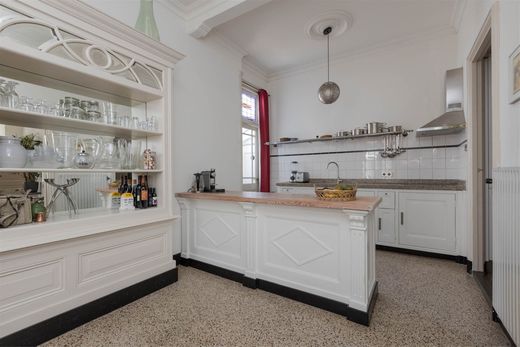 De gezellige woonkeuken met granito vloer en werkblad, betreed je vanuit de woonkamer via oude paneel/vouwdeuren met geëtst glas.